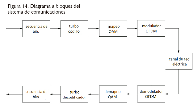 Dados los problemas de calidad de la transmisión en los canales PLC del tipo indoor modelo 1, que consisten principalmente en su característica de multitrayectoria, y de los diferentes tipos de ruido descritos: coloredo, de banda estrecha, e impulsivo, por otro lado, considerando la alta capacidad de corrección de los códigos turbo y la fuerte robustez respecto al ruido del canal de la multiplexación OFDM, en este trabajo se ha estudiado el desempeño de esos codificadores en estos canales, haciendo variar sus propiedades de codificación principalmente en función de las propiedades de los entrelazadores, que son partes constitutivas importantes de los turbo códigos; en la tabla 3 se proporcionan los valores de los principales parámetros utilizados en las pruebas simuladas en computadora (Chan y Donaldson, 1989). Efectivamente, en estudios recientes (Rosnes, 2012) se ha mostrado que las propiedades de aleatoriedad y de dispersión logradas con los entrelazadores juegan un papel muy importante en el desempeño global de los turbo códigos, incluyendo el caso práctico de una transmisión con tramas de datos relativamente cortas, es decir, de unas cuantas centenas de bits. En consecuencia, en este trabajo se lleva a cabo un estudio de análisis, clasificación y comparación con estudios previos del desempeño de los turbo códigos en este tipo de canales PLC, dando importancia a los entrelazadores utilizados, considerando también entre ellos los más promisorios, es decir, aquellos denominados HSR (High Spread Random), los cuales se explican con más detalle en esta misma sección. En la figura 14 se puede ver el diagrama general en bloques del sistema de comunicaciones utilizado en las simulaciones en computadora.