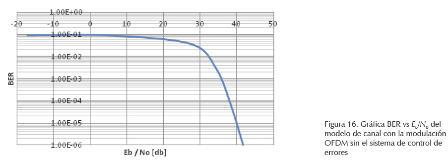 En la figura 16 se muestra la gráfica de la razón señal a ruido Eb/N0 vs la tasa de bits en error BER (Bit Error Rate) del comportamiento del canal, con la modulación OFDM sin el sistema de control de errores y con los parámetros considerados en la tabla 3. Se observa cómo empieza a bajar la curva alrededor de Eb/N0 = 30 dB al igual que en las gráficas obtenidas en Babic et al. (2006), también alrededor de Eb/N0 = 40 dB se tiene una tasa de bits en error del orden de 1 × 105.
