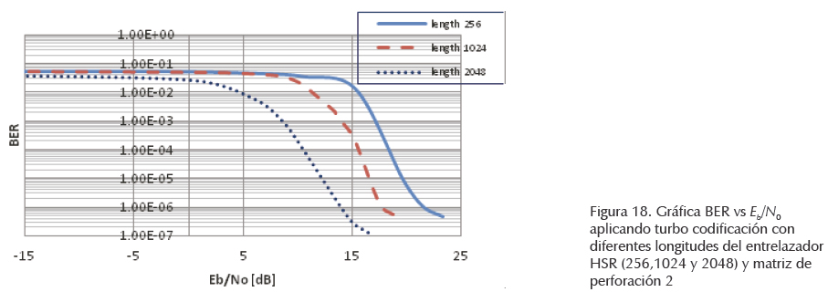 De acuerdo con la literatura, por sus propiedades de descorrelación el tipo de entrelazador utilizado es el denominado HSR (Lazcano y García, 2007 y 2012; Crozier, 2000). Su implementación es similar a la del entrelazador S-random (Divsalar y Pollara, 1995), con la variante de que se generan N números reales aleatorios, en vez de N números enteros aleatorios. El entrelazador final se obtiene al ordenar los N números reales aleatorios y su desempeño en términos de la tasa de errores binarios (BER) es superior al obtenido con el entrelazador S-random. En este trabajo, los parámetros del entrelazador HSR que se usaron son matrices de tamaños 256, 1024 y 2048 bits, con condiciones de esparcimiento máximo de 20, 32 y 45, respectivamente.