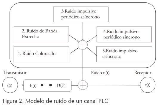 Dado que se trata de un modelo de ruido compuesto por varias perturbaciones, no es posible analizar estos tipos de canales con un modelo de ruido convencional de los sistemas de comunicaciones, como es el modelo de ruido aditivo, blanco, Gaussiano (AWGN). Zimmermann y Dostert (2002b) y Jung (2002) clasifican los diversos tipos de ruido del sistema PLC acorde con la figura 2 y los describen de la siguiente manera: