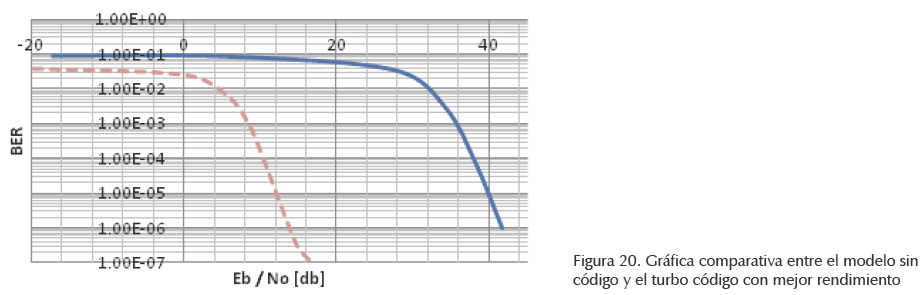 Por último en la figura 20, para una BER de 105, la curva generada al utilizar el turbo codificador con un entrelazador HSR y matriz de perforación tipo 2 de longitud 2048 elementos, existe una ganancia de 30 dB aproximadamente en la Eb/N0, con respecto a la curva obtenida cuando no se utiliza ningún código de corrección de errores.