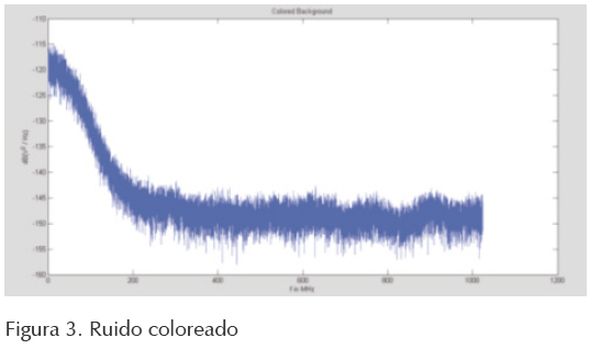 Ruido coloreado: este es ocasionado por la superposición de múltiples fuentes de ruido, es de baja potencia y decrece su densidad espectral de potencia conforme la frecuencia es mayor. La curva de la densidad espectral de potencia se aproxima por una exponencial (Babic et al., 2005). Dicha función está dada por la siguiente ecuación 2:
