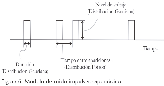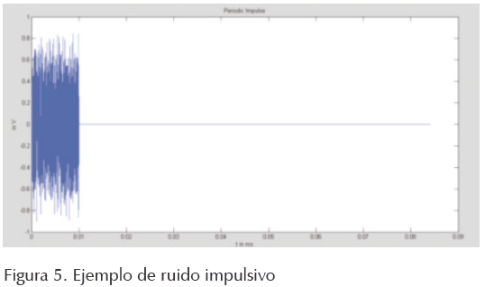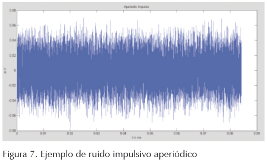 Este ruido tiene tres parámetros: amplitud, tiempo de impulso y tiempo entre impulsos, estos parámetros no son constantes (figuras 6 y 7).