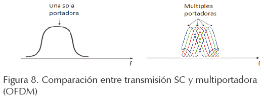 En contraposición con las comunicaciones típicas, monoportadora o single carrier (SC), donde cada símbolo se transmite en serie (uno a la vez) ocupando todo el ancho de banda disponible, en una modulación multiportadora se envían los símbolos simultáneamente en subportadoras adyacentes, es decir, usando algún tipo de multiplexación por división en frecuencia (FDM). Una representación gráfica se puede apreciar en la figura 8.