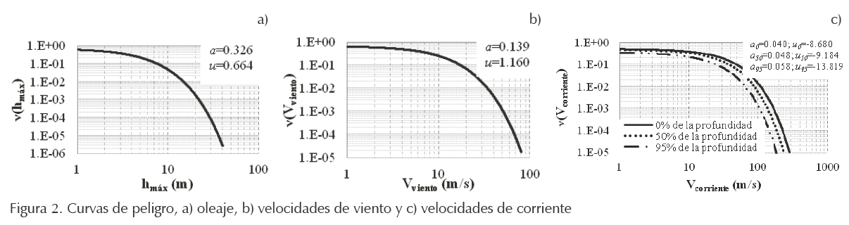 donde ϒ representa la altura máxima de ola, velocidad de viento o velocidad de corriente, según sea el caso. Los valores de a y u se muestran en la figuras 2a, b y c.