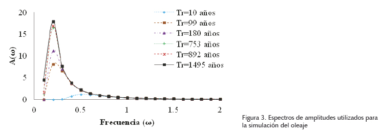 Los esfuerzos mínimos y máximos de los puntos seleccionados se obtuvieron mediante análisis dinámicos "paso a paso" en el tiempo, utilizando un conjunto de oleajes simulados, asociados a diferentes alturas de ola. El contenido de frecuencias de los oleajes se obtuvo a partir de espectros de Pierson-Moskowitz (1964) para la zona. A partir del espectro de Pierson-Moskowitz se obtienen los espectros de amplitudes de ola asociados a diferentes periodos de retorno (Tr), como se muestran en la figura 3.