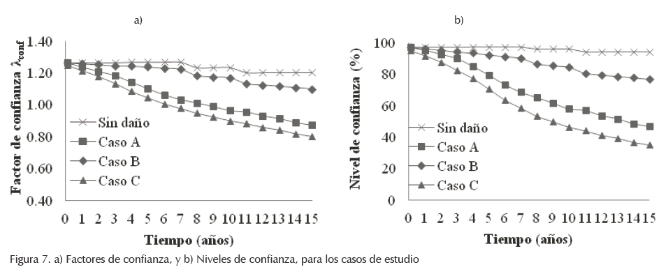 Los factores de confianza al término de diferentes intervalos de tiempo para los casos a, b, c y sin considerar daño (ecuaciones 18, 24, 29 y 5, respectivamente) se muestran en la figura 7a. Los porcentajes de decremento del factor de confianza con respecto al caso en el que no se considera deterioro estructural, al final de un intervalo de 15 años, son del orden de 27%, 9% y 34% para los casos a, b y c, respectivamente. El nivel de confianza, Kx, asociado a los factores de confianza presentados anteriormente se presentan en la figura 7b. Se indica que el nivel de confianza para los casos de estudio disminuye a medida que el intervalo de tiempo aumenta. Para el caso en el que no se considera daño, el valor de se mantiene prácticamente constante con valor de 94%; sin embargo, al término de 15 años el nivel de confianza disminuye de 94% a 77%, 47% y 36%, para los casos a, b y c, respectivamente.