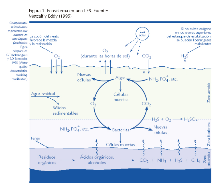 Controlar la contaminación hídrica ocasionada por aguas residuales municipales tiene justificación en problemas ambientales como la generación de gases efecto invernadero, GEI, la presencia de disruptores endocrinos (Janex et al., 2009), la eutrofización de fuentes de agua (Zimmo et al., 2004; Wallace y Austin, 2008) y el deterioro de la calidad de las fuentes de agua. Un enfoque ecológico en el estudio de lagunas facultativas secundarias, LFS (Figura 1. ), apunta a conocer las relaciones establecidas entre la estructura de este ecosistema y las funciones que cumple. Un proceso de simulaciónmodelación puede explicar dichas relaciones, haciéndolo una herramienta útil para su análisis (Jamu y Piedrahita, 2002). Para analizar una LFS es posible apelar a procedimientos matemáticos que analicen los fenómenos multidimensionales (Legendre y Legendre, 2004) que suceden en estos complejos ecosistemas; el modelado puede integrar variables hidrodinámicas y cinéticas y es una herramienta con amplias posibilidades en el campo del tratamiento de las aguas residuales (Zima et al., 2009; Alvarado et al., 2012; Sah, 2009; Beran y Kargi, 2005; Houweling et al., 2008; Abbas et al., 2006). Disponer de modelos de LFS que conjuguen su ecología, incorporen sus propiedades dinámicas, componentes y variables (Jamu y Piedrahita, 2002) posibilitará la búsqueda de un ambiente sano con criterios de justicia ambiental (Rees, 2008).