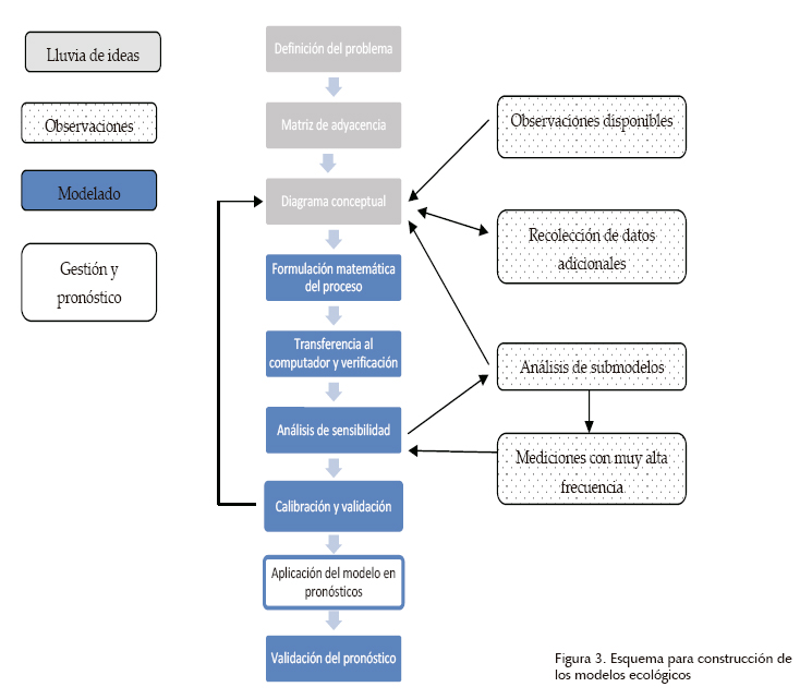 La formulación de los modelos fue guiada por la propuesta de Jorgensen y Bendoricchio (2001) (figura 3). El diagrama conceptual se desarrolló con el software Structural Thinking Experimental Learning Laboratory with Animation, Stella, de ISEE Systems Inc.®. Este software se ha utilizado para simular modelos ecológicos y ofrece ventajas desde el punto de vista gráfico y de cuantificación (Jamu y Piedrahita, 2002). Las expresiones de balance de materia para cada especie fueron la base para la formulación matemática de los modelos ecológicos (ecuación 1). Los modelos consideraron condiciones no estacionarias, lo que definió una variación con respecto al tiempo de las especies químicas estudiadas.