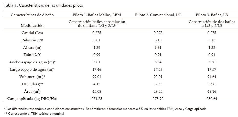 La investigación fue ejecutada en la Estación de Investigación de Aguas residuales y reúso de Ginebra, EIG, localizada en el Valle del Cauca, Colombia, a 3° 43' 50'' latitud norte y 76° 16' 20'' longitud este, a 1040 ms.n.m. La temperatura promedio es 23°C y la precipitación promedio es 1280 mm. Se hizo seguimiento a tres LFS con distintas configuraciones físicas (tabla 1). El diseño de las unidades piloto se realizó empleando la metodología de carga orgánica superficial (Mara, 2001) aplicando un análisis de incertidumbre (Von Sperling, 1996) con base en la propuesta de Banda (2003).