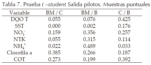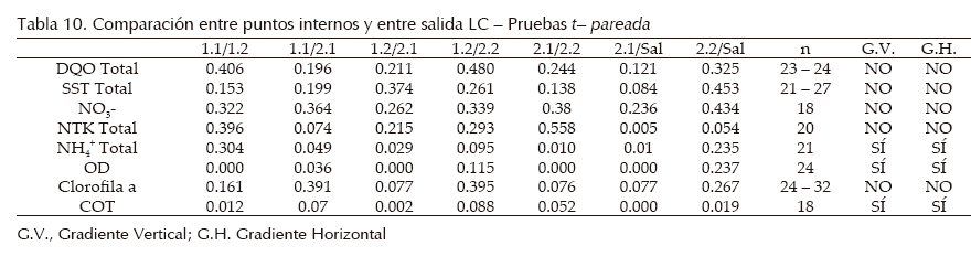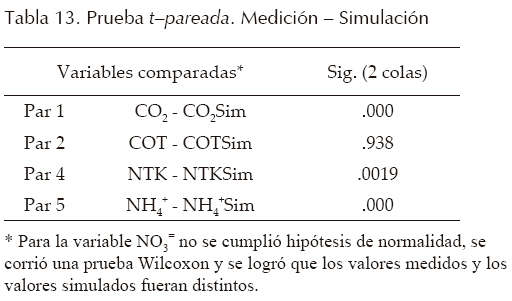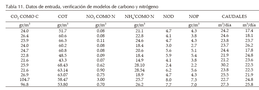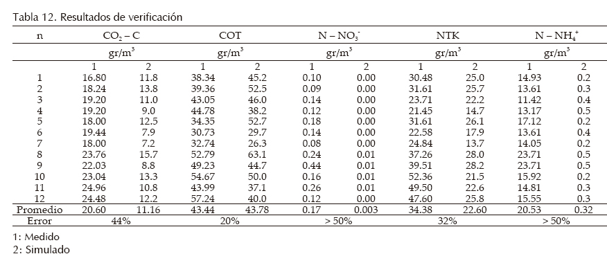 La tabla 12 presenta los resultados obtenidos en el proceso de verificación. Las pruebas estadísticas indican que los datos se distribuyeron de forma normal y que los valores de COT del modelo (tabla 13) fueron estadísticamente iguales a los medidos en campo. Dado que los promedios de las diferencias entre los valores simulados y los valores medidos para las variables CO2, COT y NTK fueron inferiores a 50%, a excepción de las variables NH4+ y NO3, se consideró que los modelos quedaron verificados. Las etapas de análisis de sensibilidad y calibración permitirían ajustar los modelos para las variables CO2, NO3, NH4+ y NTK; solo se presenta el ejercicio para COT y N4+.