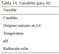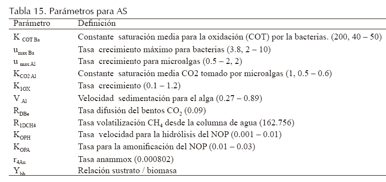 Las variables y parámetros en este análisis se presentan en las tablas 14 y 15, respectivamente; para su selección se analizaron los valores medidos en campo y se revisaron los parámetros que fueron objeto de calibración en otros estudios (Beran y Kargi, 2005; Sah, 2009; Senzia et al., 2002).