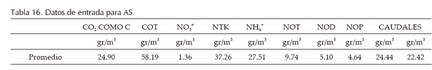 Para el caso del modelo de C se calibró el COT. Se aceptó un error promedio hasta de 10% entre los datos del modelo y los de campo. Se adoptó un valor constante de CO2= correspondiente al promedio de los datos de campo, dado que la influencia de esta variable sobre el COT no fue significativa, el caudal de salida se adoptó igual al de entrada (tabla 19).