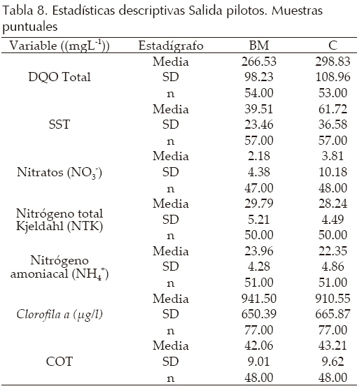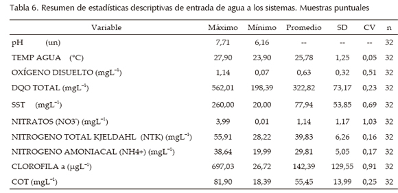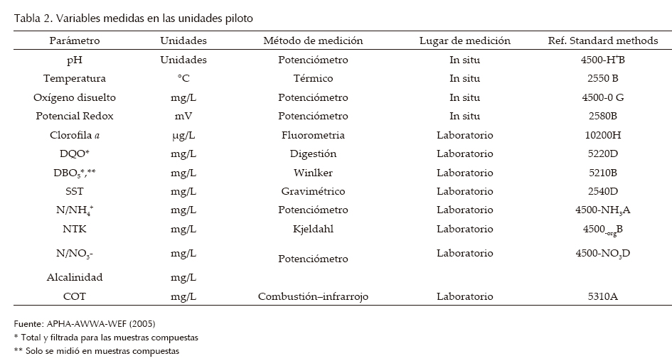 La figura 2 ilustra los pilotos y los puntos de muestreo. En P1 y P2 se tomaron muestras puntuales a dos profundidades, 0.05 m y 0.75 m, a las 10:00, 13:00, 17:00 y 22:00 horas teniendo en cuenta las variaciones meteorológicas; también se tomaron muestras puntuales y compuestas a la entrada y la salida de cada unidad. Se midieron caudales en forma volumétrica a la entrada y a la salida y se realizaron pruebas físico-químicas de las variables de interés a todas las muestras recolectadas (tabla 2). Con esta información de seguimiento se obtuvo información para la validación y calibración de los modelos ecológicos propuestos.