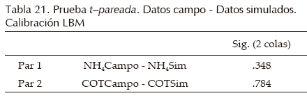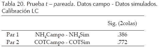 Los resultados de la calibración se probaron con una prueba tpareada, relacionando los datos de campo y los datos de la simulación (Tabla 20).