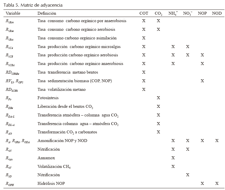 Los valores de nitrógeno asociado a microalgas y bacterias se estimaron a partir de la literatura (Mišurcová et al., 2010; Bradley y Nichols, 1918; Fagerbakke et al., 1996). En la tabla 5 se presentan las interacciones entre las distintas especies de análisis de los modelos propuestos para C y N.