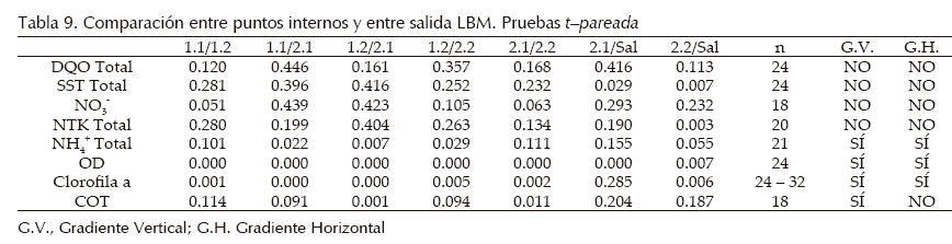 Lo anterior indica que existieron condiciones distintas de transformación de C y N en las unidades teniendo en cuenta las variaciones identificadas entre los puntos cercanos a la salida y las salidas (P21/Sal, P22/Sal). Encontrar gradientes de Clorofila a como indicador de la presencia de microalgas en el caso de la LBM sugiere que la transformación de los compuestos de C y N está ligado a la fotosíntesis; esta aseveración coincide con los gradientes de microalgas identificados en otros ejercicios de modelado (Beran y Kargi, 2005; Sah, 2009). El uso del modelo de RCM quedó verificado para LC y para LBM, en el sentido de suponer disponibilidad de recursos de manera homogénea; sin embargo, los bafles y las mallas de las LBM promueven una mayor compartimentación de los procesos, como lo encontrado en el modelado hidrodinámico de lagunas con bafles que indican tendencia a Flujo Pistón, (Shilton y Harrison, 2003; Sah, 2009; Abbas et al., 2006).