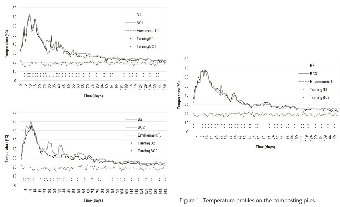 A temperature above to 55°C was reached during 7 to 10 days in the piles B1, B2 and B3, and during 9 to 12 days in the piles BC1, BC2 and BC3. Therefore, an enhancement of hygienization process was observed by using WA. However, this temperature level was no possible to keep for more than 14 days, as recommended by Krogmann et al. (2010) for a complete hygienization. This might be explained due to the substrate characteristics. The process was in a thermophilic range (T > 45°C) during 18 days in piles B1 and BC1, 16 and 15 days in piles B2 and BC2, and 24 and 22 days in piles B3 and BC3 respectively. Therefore, the gradient temperature was increased by using from 4% to 8% of WA.