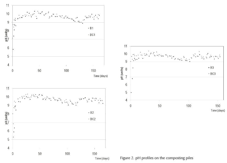 In general, differences in the Physicochemical characteristics among substrates B1, B2 and B3 were observed. These differences can be explained due to temporal variability of substrates quality for the composting of MBW, as reported in other studies (Herity, 2003; Ward et al., 2005). The pH levels in MBW were in the acid range and a positive effect was observed by the incorporation of WA, increasing pH values in some cases up to neutral (BC1) or alkaline ranges (BC2 y BC3). However pH values in BC2 and BC3 were higher than those recommended by Krogmann et al. (2010). Therefore, nitrogen losses as ammonia might be presented when high temperatures are reached in the composting process (de Bertoldi et al., 1983).