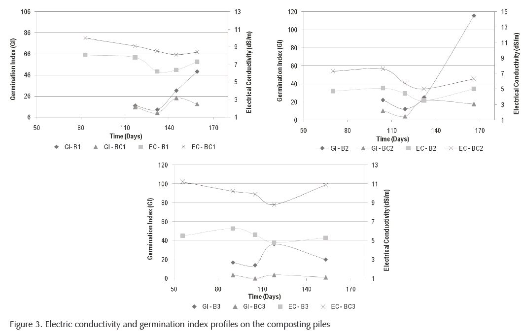 Due to the importance of studying the evolution of product maturation, EC and GI were monitored after the 90th day. EC was measured using a conductivimeter WTW model 325. GI tests were performed by determining the sensitivity of radish (Raphanussativus) to products, following the procedures established by INN (2004) and Varnero et al. (2007). The process was monitored until the temperature of the piles was around room temperatures ±5°C and the product had soil smell. Thus, the maturation process was reached (Dulac, 2001). A descriptive analysis of temperature, pH, EC and GI was carried out.