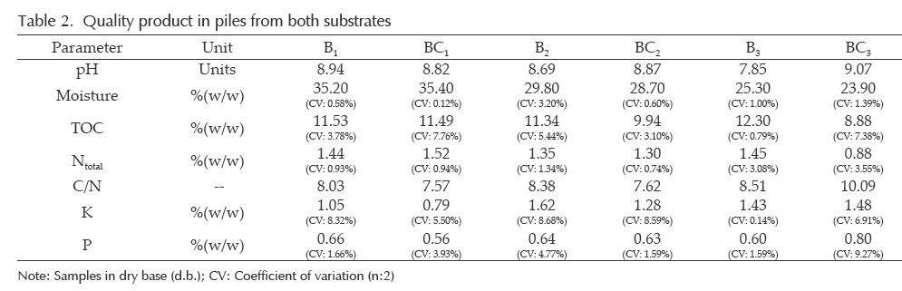 Once the monitoring period was completed, a representative sample of each pile was taken, as recommended Sullivan and Miller (2001). The same parameters measured in samples were measured in the product. Thus, the substrate quality was determined in pH level, moisture, TOC, K, P, Ntotal. Quality results of the product were compared with the limits establish in NTC 5167 (ICONTEC, 2003).