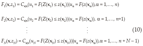 Considérese el condicionamiento del campo aleatorio Z(x) en N localidades i dado un conjunto α con n observaciones. La función de distribución N-variada acumulativa condicional (CCDF) de Z(x) se puede escribir: