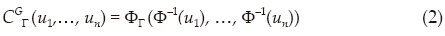 La cópula V-transformada multivariada se obtiene aplicando una transformación no lineal a un campo aleatorio gaussiano G(x) con media cero, varianza unitaria y matriz de correlación Γ, tal que (Bárdossy y Li, 2008; Li y Bárdossy, 2009):