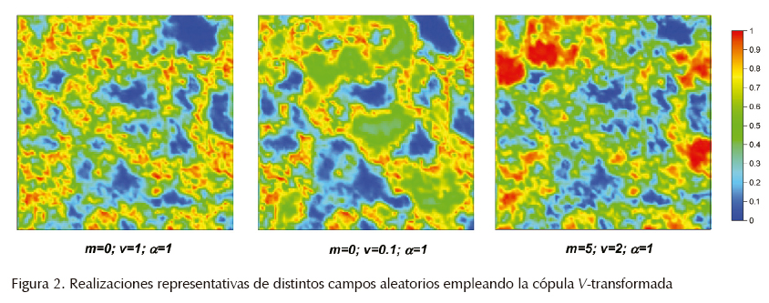 La estructura de correlación prescrita para el campo aleatorio en los diferentes casos de asimetría se obtiene siguiendo el procedimiento descrito anteriormente. La contribución de varianzas y las distancias de correlación de los diferentes modelos de correlación anidados se muestran en la tabla 1. Con estos modelos de correlación, los parámetros de la cópula V-transformada indicados en la misma tabla y siguiendo el algoritmo propuesto se generaron 15 realizaciones de cada campo aleatorio sobre una malla cuadrada de 75 m por lado espaciada regularmente cada 1 m. La segunda realización de cada conjunto se muestra en la figura 2 y sus descriptores estadísticos en la figura 3.