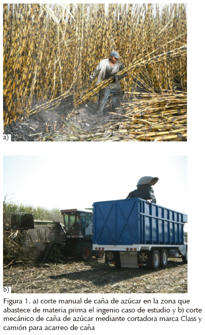 La cosecha puede llevarse a cabo de forma manual o mecánica (figura 1). La quema de la caña se realiza con la finalidad de facilitar y agilizar el corte manual de la caña, eliminar la maleza o ahuyentar animales. El corte manual de caña quemada se realiza al ras del suelo, despunte al viento y se junta en manojos de 300 a 500 kg, los cuales se recolectan por medio de alzadoras en camiones. Las máquinas cosechadoras cortan un surco por pasada, pican la caña y por diferencia de densidad mediante ventiladores se separan las hojas; de esta manera, las hojas quedan distribuidas uniformemente sobre el campo y la cosechadora entrega la caña picada directamente a los camiones que se encargan de su acarreo al ingenio. Para el uso eficiente de una máquina cosechadora es necesario utilizarla en terrenos de al menos 5 ha y con distancias largas (500 m).
