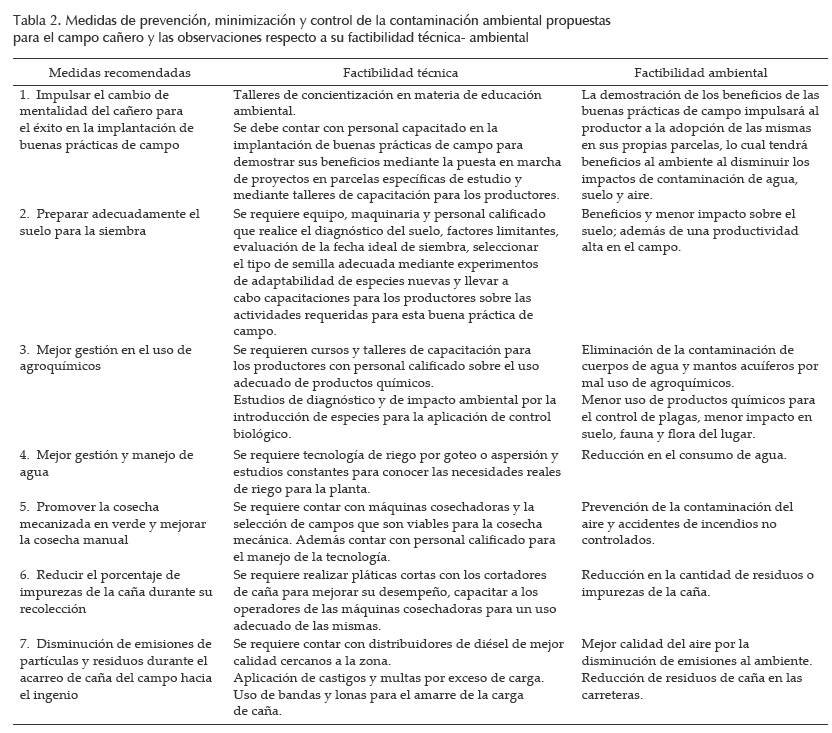 A continuación se presentan las propuestas de prevención, minimización y control de la contaminación ambiental para el campo cañero (tabla 2) y el ingenio caso de estudio (tablas 3 y 4).