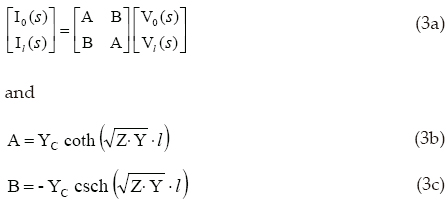 where V0(s)and I0(s) are the voltage and current vectors at the sending-end of the line z = 0. Vl(s) and Il(s) are vectors of voltages and currents at remote-end of the transmission line or, in this case, cable system z = l.