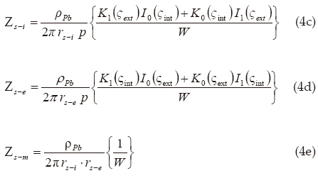 The internal, external and mutual impedances of the tubular sheath conductor are given by the Schellkunoff theory for cylindrical formulae (Schellkunoff, 1934):