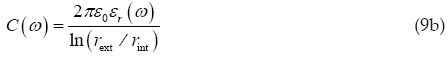 where G(ω) is the shunt conductance which represents the Ohmic losses and C(ω) is the shunt capacitance which represents displacement current flowing between conductors through the specific dielectric. Assuming a concentric cable geometry, the capacitances are given by (Dommel, 1986):