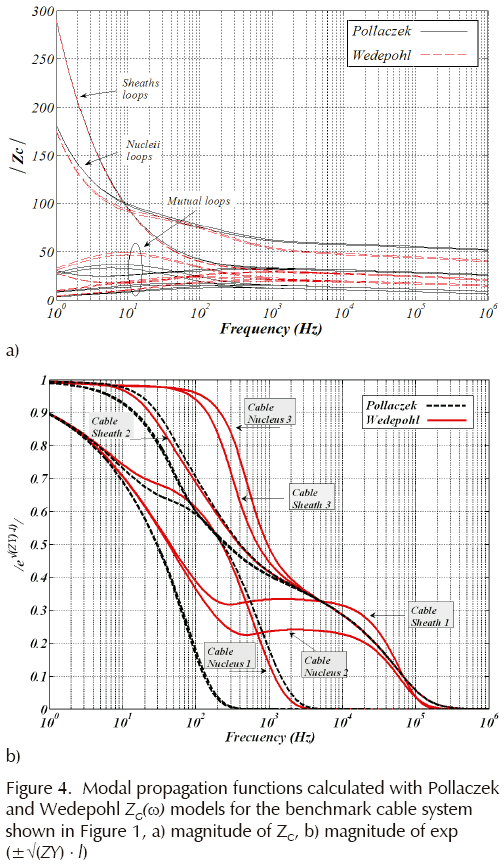 Figure 4 shows the decreasing monotonic behavior of |ZC| and |e ±√(Zϒ)x·l| which have been evaluated with two different ZG(ω) models (Pollaczek and Wedepohl). The mode switching effect on H±(ω) has been removed by using the alternate method proposed by Wedepohl in (Wedepohl et al., 1996) for calculating transformation matrices tracking the order of eigenvectors and eigenvalues with their previous one corresponding frequency. The ZC of the system directly depends on the relation between frequency dispersion conductor effects and on the insulation relaxation effects of the cable.