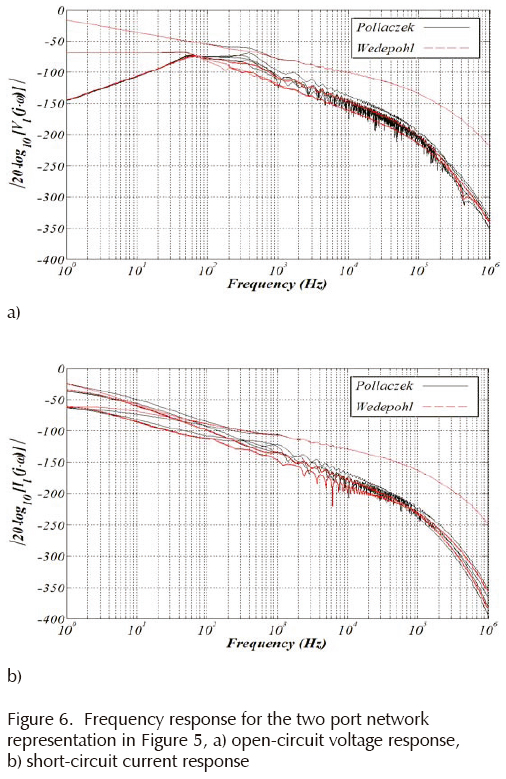 The accurate calculation of Zϒ has been performed in the evaluation of parameter matrices A and B in (Equations 3a and 3b) with the Pollaczek and Wedepohl ground-return models. The nodal representation in (3a) is shown in Figure 5 where the cable system length l = 40 km. The open-circuit voltage and short-circuit current frequency responses are shown in Figure 6.