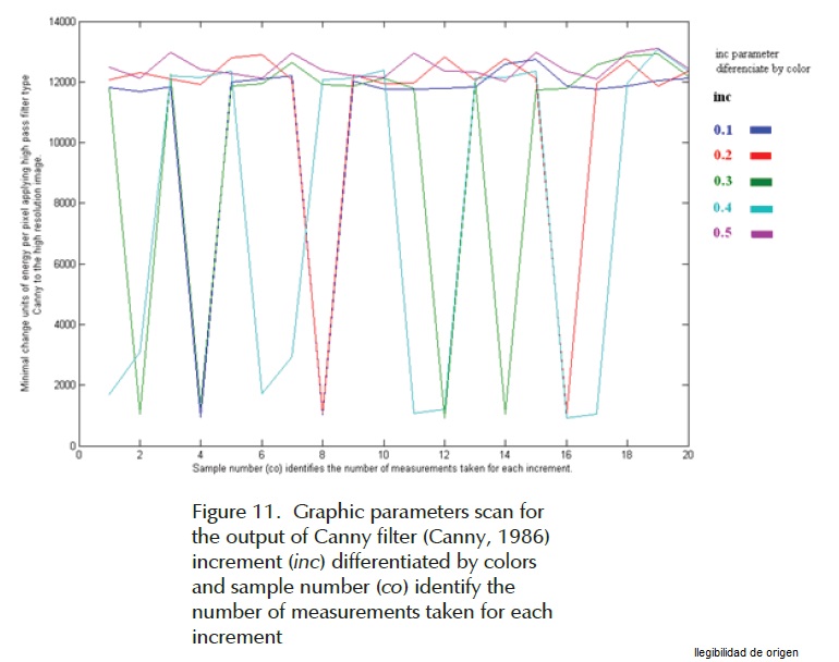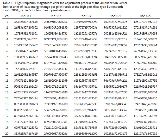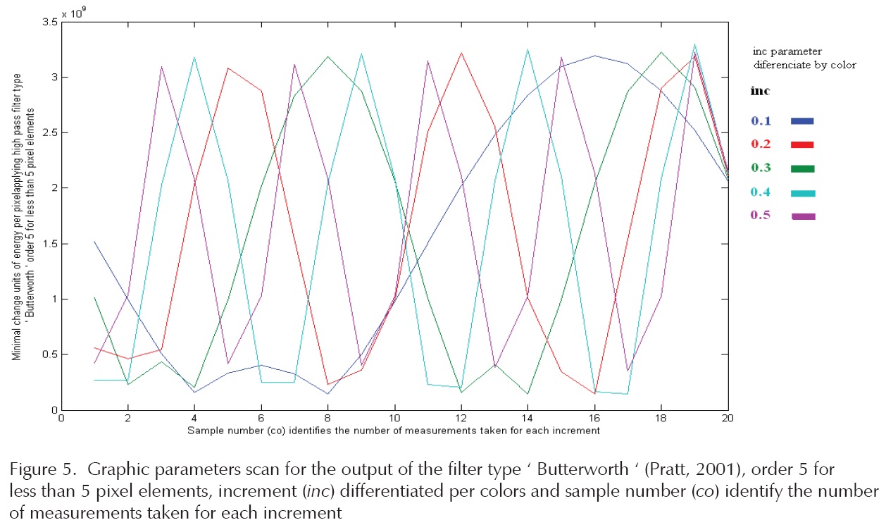Figures 6 or 8 show how a periodicity exists in each row; for example, if inc = 0.4 the best result appears every 5 figures and the resolution of the output image increases according to equation (22). For a good result, if inc = 0.4 then co = co0 + n • 5 when co0 = 4, equations (15) and (16) get the exact dimensions. But the best result for the Butterworth guide comes from Table 1, co = 19, inc = 0.4 where this pattern combination gives us the maxim conservation value of the frequency range of the filter (Figure 9).
