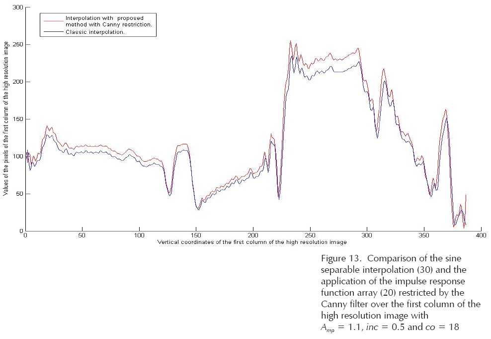 Compare, in Figure 13, the results of the sine separable interpolation (30) and the application of the impulse response function array (20) restricted by the Canny filter over the first column of the high resolution image. Figure 11 shows the periodicity and the peaks useful for the amplification. The map of figure 12 has localized a zone where exist a maximum value obtained from the Table 2, with co = 10 and inc = 0.5. Figure 14 shows how the high resolution image maintains the original contrast. This figure has better conserved contour information than the one obtained with the classic interpolation using the impulse response function array (30).