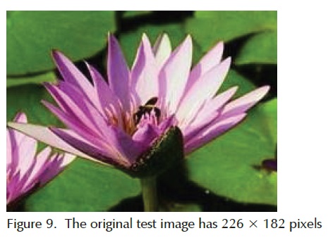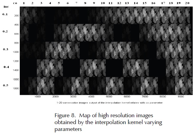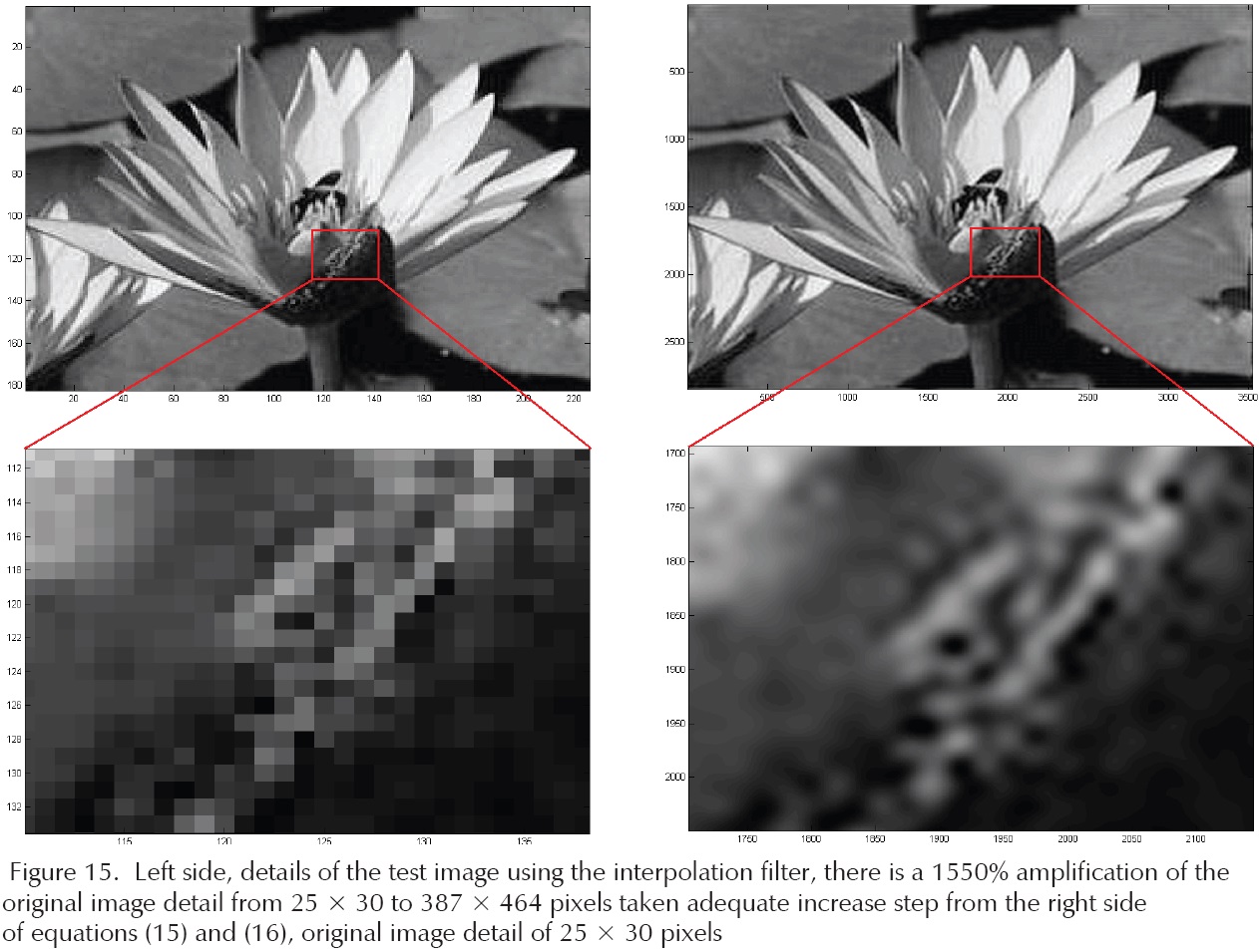 Other aspect is the control of the coordinates of amplification of the filter. It is shown in Figures 6 or 8 how periodicities exist in each inc row. The argument of the sine components of the impulse response function array in function (20) are near π/2 with the exploration parameters inc = 0.4 and co = co0 + n • 5 for the contour interpolation. The amplification suited under this condition takes the dimensions desired using (15) and (16). Figure 10 is an exact amplification to the precise coordinates. But this process gives losses with the guide of the Butterworth filter. When controlling the amplification it is preferable, for the conservation of high frequency content in the high resolution plane, to find a local maximum using the Canny filter. A whole number is used as multiplier to increase the interpolation kernel dimensions. Another important topic is the comparison applying the classical separable sine impulse response function array (30) and the interpolation results with the impulse response function array (20) constrained by the neighbor detector filter Canny type. It is shown how the restriction increases the range of the pixels values doing a contribution to the high frequency conservation in the high resolution plane. In the last case it is analyzed how the guide of Canny is useful to construct an interpolation kernel in order to obtain a very high resolution image taking only maximum local values in a range. The parameters, when the high frequency content increases, represent the adequate amount of sampler components in the impulse response array S(x, y) of equation (1) for the interpolation. The sampler components are more numerous than the samples of the original image for the interpolation, but the position of these are in the active zone of the resolution cell of the physical scan model and consequently over the valid values of the pixels in the original image and not between. Then the interpolation kernel increases by a whole number multiplier for the adequate parameters Amp, inc and co giving a high frequency maximum in an initial range. Using this mode we obtained a very high resolution image. The high frequency content in the high resolution plane was retained. Figure 15 shows how this effect occurs over an amplification of the 1550% in each coordinate.