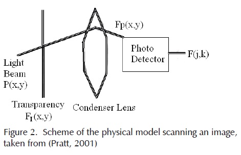 In the example of Figure 2, a thin beam of light goes through a photographic transparency of an ideal image. Passing light is collected in a condenser lens and is sent directly to a photo detector. The electrical output from the photo detector is integrated over a period of time during which the light beam activates a resolution cell. In this type of system is considered that even lens with perfect focus produces some blurring because of the diffraction limit of its opening (O'Neill, 1963).