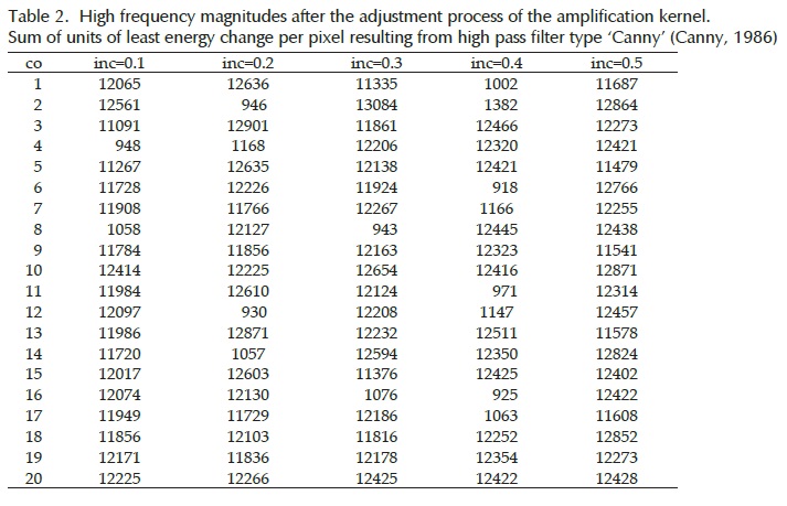 The investigation shows the main aspects of the interpolation with restriction for the amplification. For instance, which is the goal in the amplification process? What filter could be the guide for the parameters in the construction of the response impulse function or amplification kernel? The Butterworth filter takes in consideration a range of high frequencies, in the case for Δx = 5 pixels, but the main trouble in the interpolation is the contour conservation or high frequencies, that are just over π. The results of amplification guide by Butterworth give possible combination of parameters for equations (15) and (16) in a range of frequencies. In order to have better results it is necessary to use a filter directly related with the contour information of the image. The edge detectors are developed with a robust capacity for the detection. One famous detector is the Canny filter (Canny, 1986).Then the high frequencies of the interpolation output are related to the impulse response function array using the Canny filter. We found the adequate parameters inc and co in order to make the interpolation kernel, increase the high frequency content in the high resolution image.