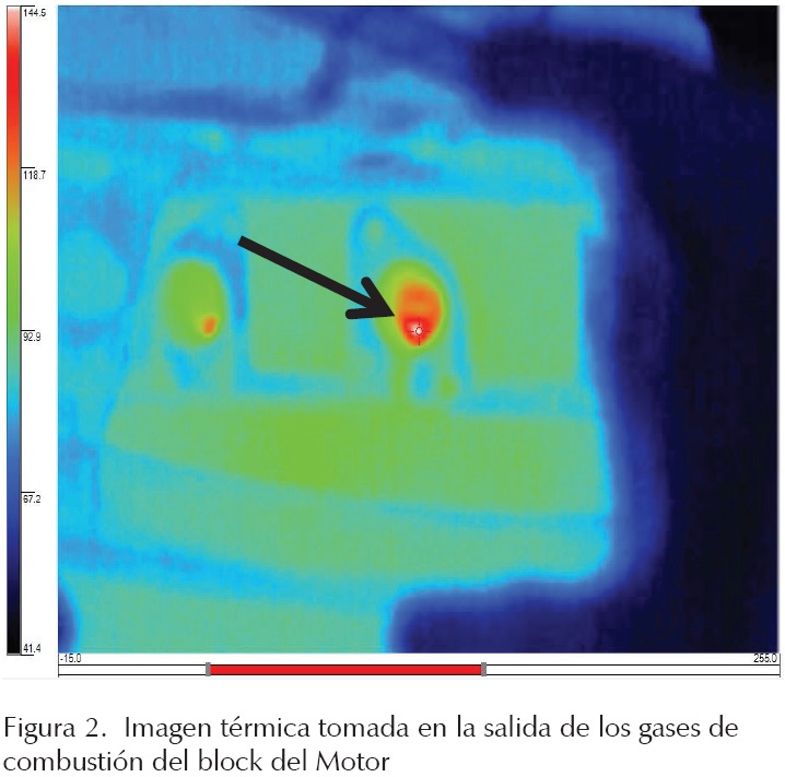 En la simulación se realizaron corridas con diesel y mezclas diesel-biodiesel B5, B10, B20 y B50, así como B100 (donde el número consecutivo a la letra B denota el porcentaje de biodiesel presente) en las cuales se utilizó una relación masa-masa de aire-combustible de 1:15 (Workshop, manual diesel engine Kubota). Como información adicional, se ingresaron al simulador datos de temperatura de gases de combustión que se midieron con una cámara termográfica Fluke Ti30, con rango de temperatura de 15°C a 255°C, como se muestra en la figura 2.