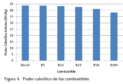 Las variaciones porcentuales del poder calorífico para las mezclas restantes con respecto al diesel, B50, B20, B10 y B5 fueron de 6.42%, 2.57%, 1.27% y 0.54%, respectivamente.