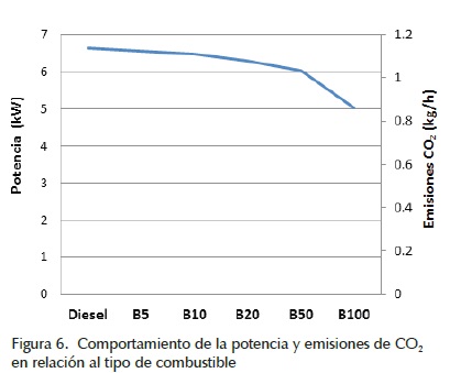 La figura 6 muestra la relación entre potencia y emisiones de CO2 en función de la concentración de biodiesel. Se puede observar que al incrementar la concentración de biodiesel disminuye la potencia generada y al mismo tiempo se reducen las emisiones de CO2.