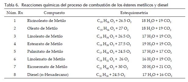 Las reacciones químicas consideradas en la combustión de los ésteres metílicos (biodiesel), diesel y sus diferentes mezclas (B5, B10, B20, B50) que fueron ingresadas al simulador, se destacan en la tabla 6.