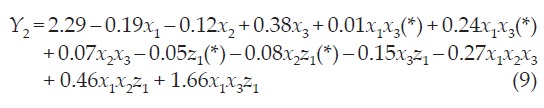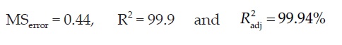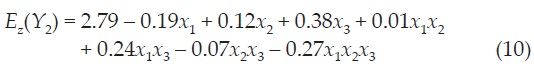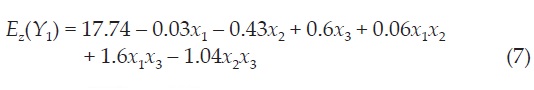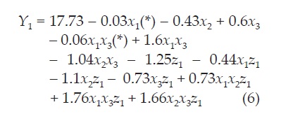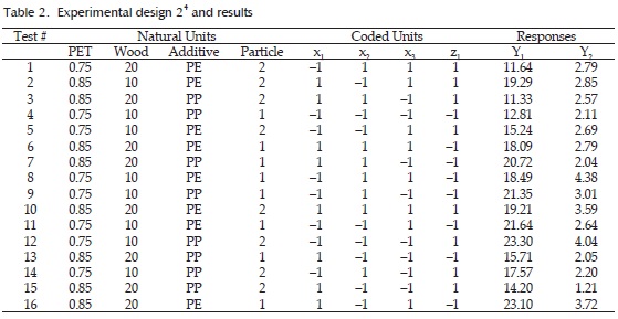 Table 2 shows the experimental combinations, in random order, the factors and their levels used in each run in coded units and the values of the two response variables. Using the values of Table 2 a model for each response by least squares method was fitted.