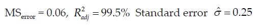 According to the ANOVA, the model and most of its terms were statistically significant. The non-significant ones, in equation (6), are marked (*). Relevant information from the statistical analysis is given below.