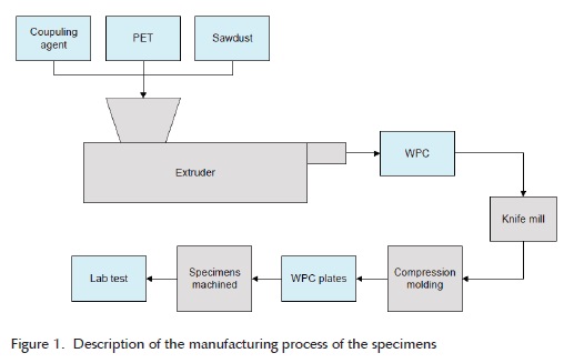 Composite specimens were molded with a thermoplastic resin of PET with high and low viscosity, and a sawdust filler. The PET, defined as PET 0.75 and PET 0.84 was obtained from the company INVISTA (Mexico, DF). Sawdust was obtained from a local lumber yard and the additive, which functions as a coupling agent (polyethylene/polypropylene), was obtained from the company CELANESE (Mexico City).