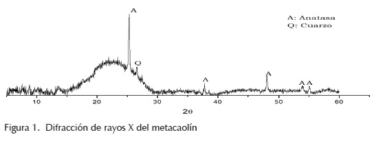 Como precursor se empleó un metacaolín comercial MetaMax® (MK), con la presencia de pequeñas trazas de anatasa (TiO2) y cuarzo (SiO2) (figura 1), con una superficie específica de 12.7 m2/kg, una distribución de tamaño de partícula comprendida entre 1 y 40 µm y un tamaño medio de partícula de 7.8 µm.