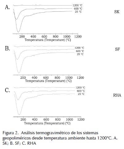 Las curvas termogravimétricas de cada uno de los sistemas en estudio (SK, SF y RHA) expuestos a 1200ºC exhibieron perdidas en peso no mayores que 2%, indicando un cambio estructural significativo por efecto de la exposición a dichas temperaturas, las cuales se analizarán con mayor detalle más adelante. Estos cambios estructurales, así como la ausencia de picos en 25-300ºC, indican la completa deshidratación del material y su correspondiente densificación.