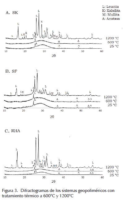 La exposición de los materiales a 1200ºC condujo a una transformación del gel K-A-S-H mediante una organización estructural por medio de la liberación del agua adsorbida en el gel (tal como se observó con los resultados de TGA) y la posterior cristalización de estructuras tipo leucita (KAlSi2O6, Pattern diffraction File, PDF 00-038-1423) para cada uno de los sistemas en estudio (SK, SF y RHA). Esto condujo a una disminución significativa del grado de amorficidad, la cual se puede identificar mediante la desaparición de la desviación de la línea base en los difractogramas de los materiales expuestos a 1200°C. La mayor intensidad de los picos atribuidos a la leucita para los sistemas SK y RHA puede atribuirse a un mayor contenido de silicatos solubles en el sistema que contribuyen a la formación de geles K-A-S-H más ricos en sílice, los cuales sufren un mayor grado de cristalización luego del tratamiento térmico. El menor grado de disolución por parte del SF conduce a un sistema con un menor contenido de sílice disponible durante la geopolimerización y por tanto la reducción en la cantidad de leucita formada durante el tratamiento.